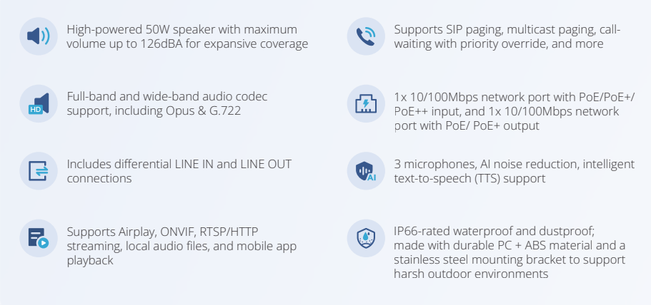 - High-powered 50W speaker with maximum volume of 126 dBA, ideal for coverage of expansive outdoor areas